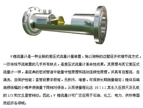 V錐流量計(jì)是一種******的差壓式流量計(jì)量裝置,并以******的邊壁逐步收縮節(jié)流方式,一改傳統(tǒng)節(jié)流的幾乎所以缺點(diǎn),是差壓式流量計(jì)建設(shè)性成果,可廣泛用于石油,化工,電力,熱供等國(guó)民經(jīng)濟(jì)各領(lǐng)域